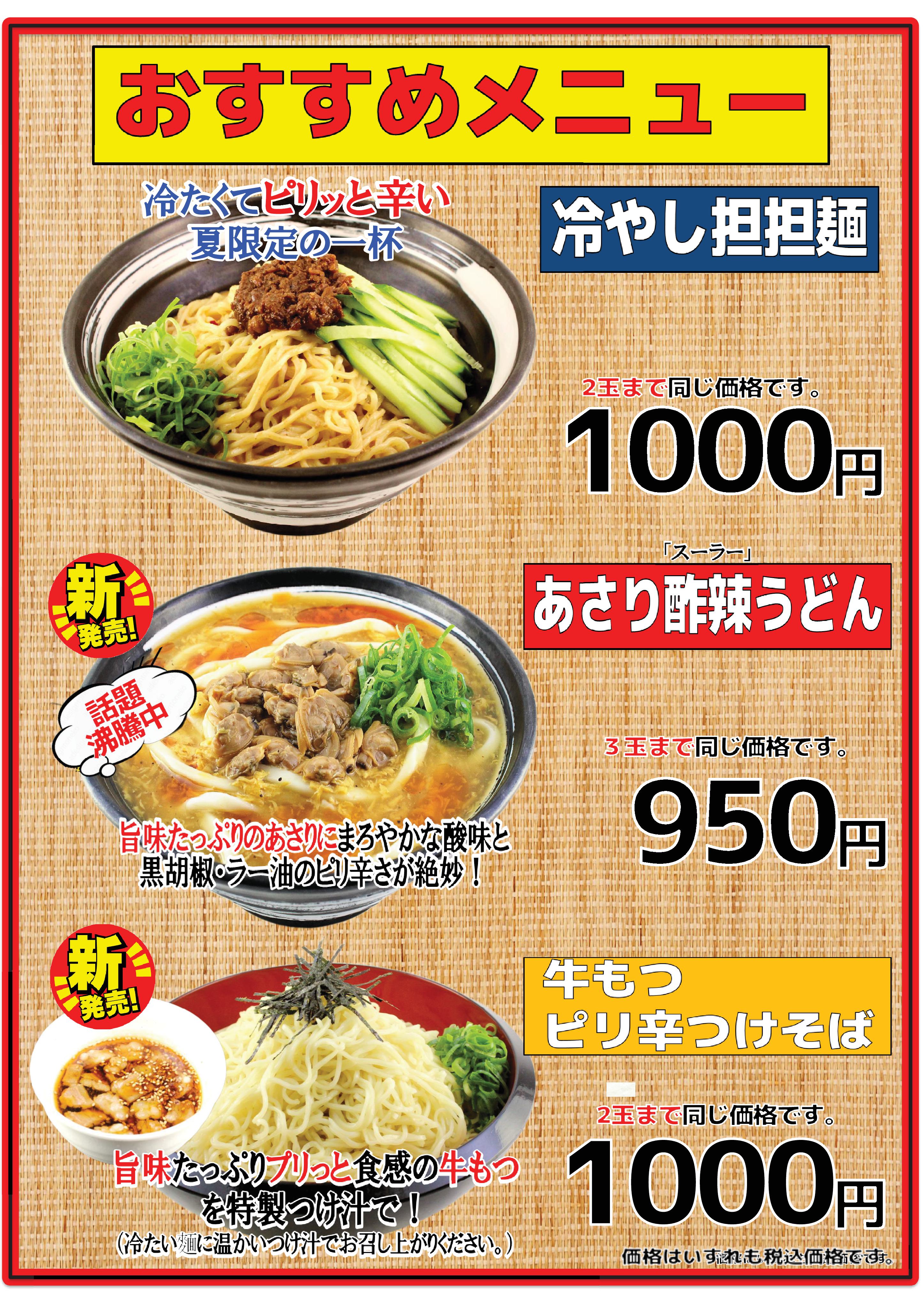 「牛もつピリ辛つけそば」 旨味たっぷり、プリッと食感の「牛もつ」を 冷たい麺に、温かい特製つけ汁でお召し上がりください! 替え玉1玉まで無料!